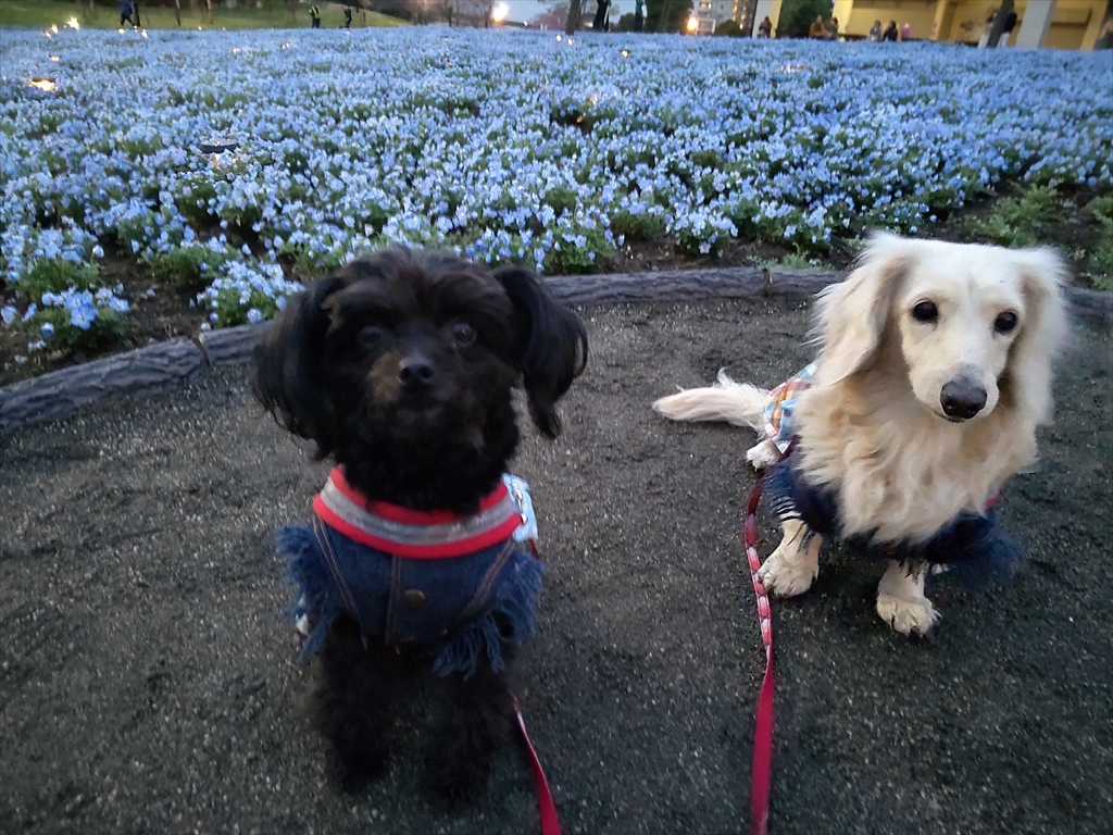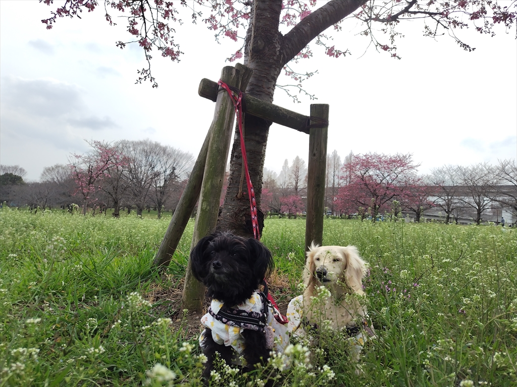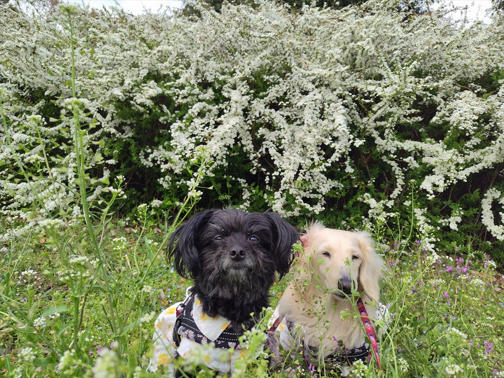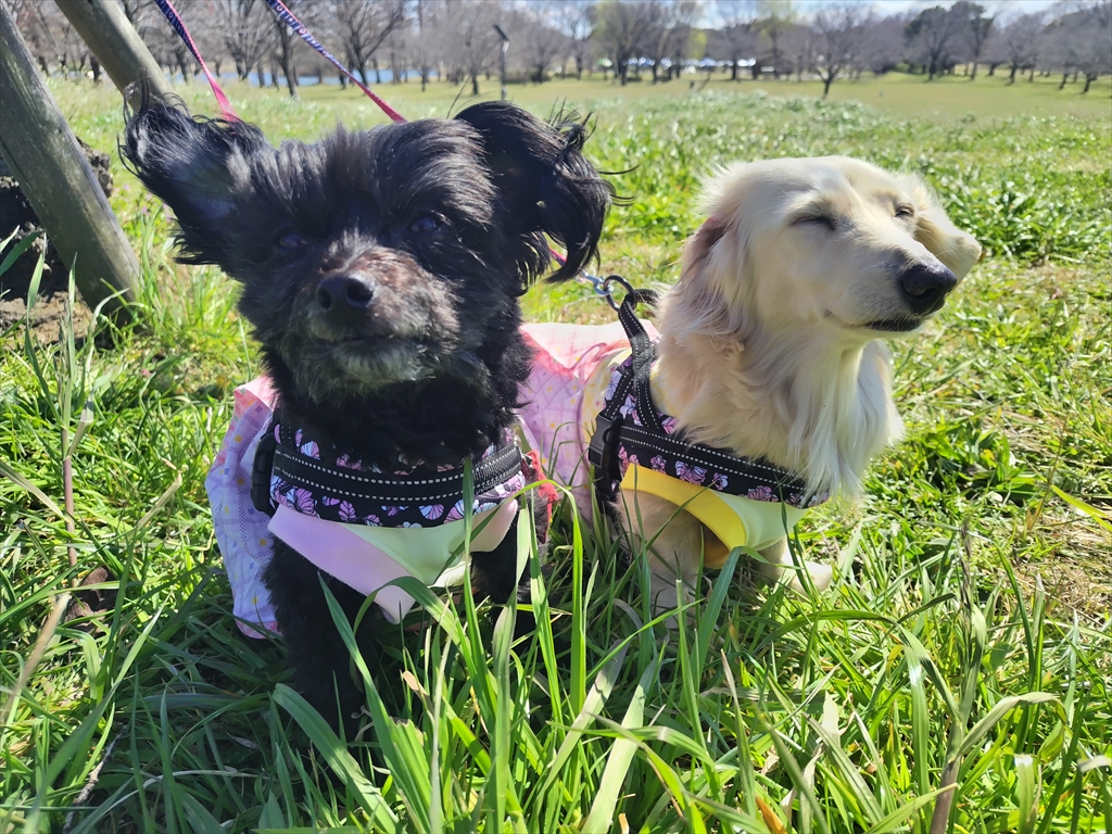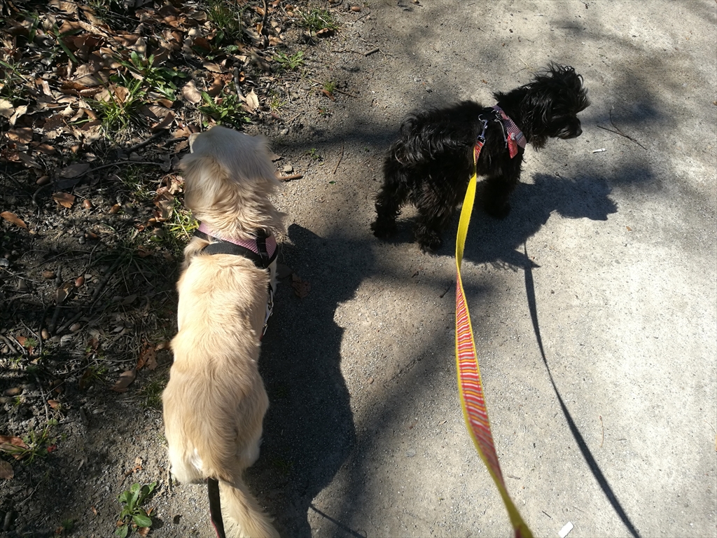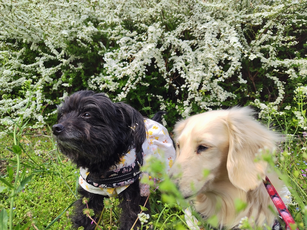 シャンプーされてお怒り中の犬とドライヤーされて落ち込む犬。