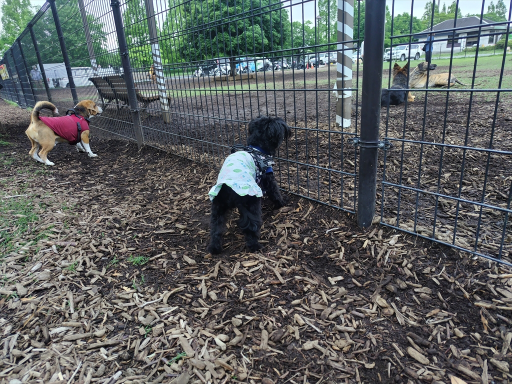 いつものドッグランで、グレート・デーン様が振り向いてくれるのを待つ犬。