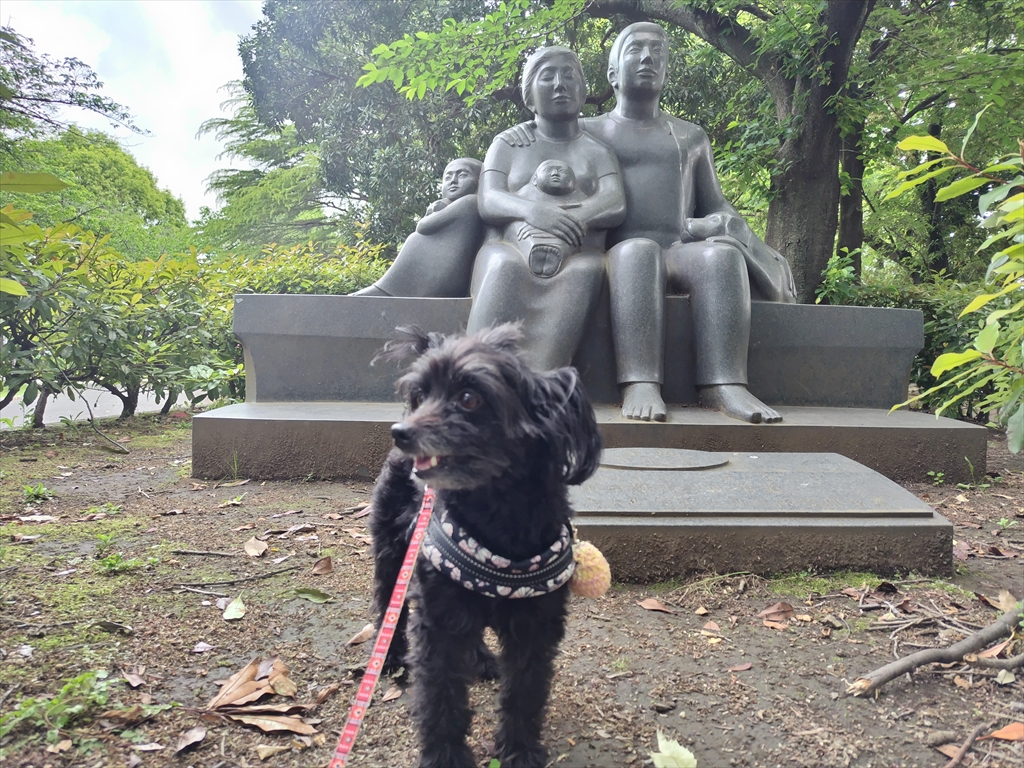 シロツメグサいっぱいの公園で、急遽仲間に入れてもらえた犬。
