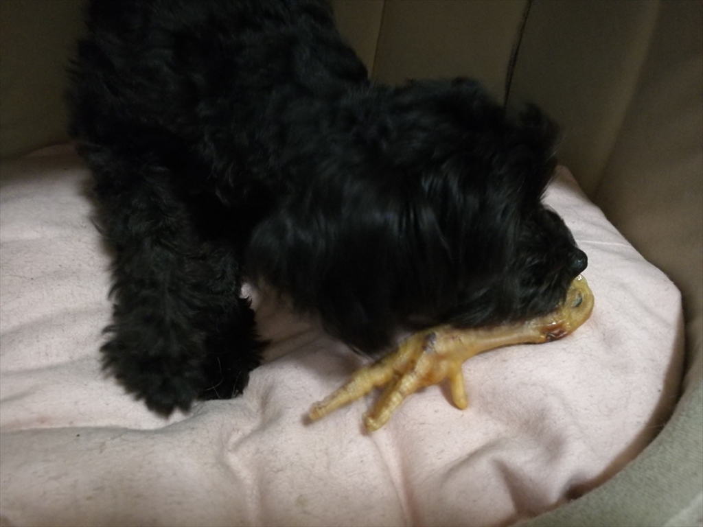 お友達にいただいた「モミジ」をほおばる犬。