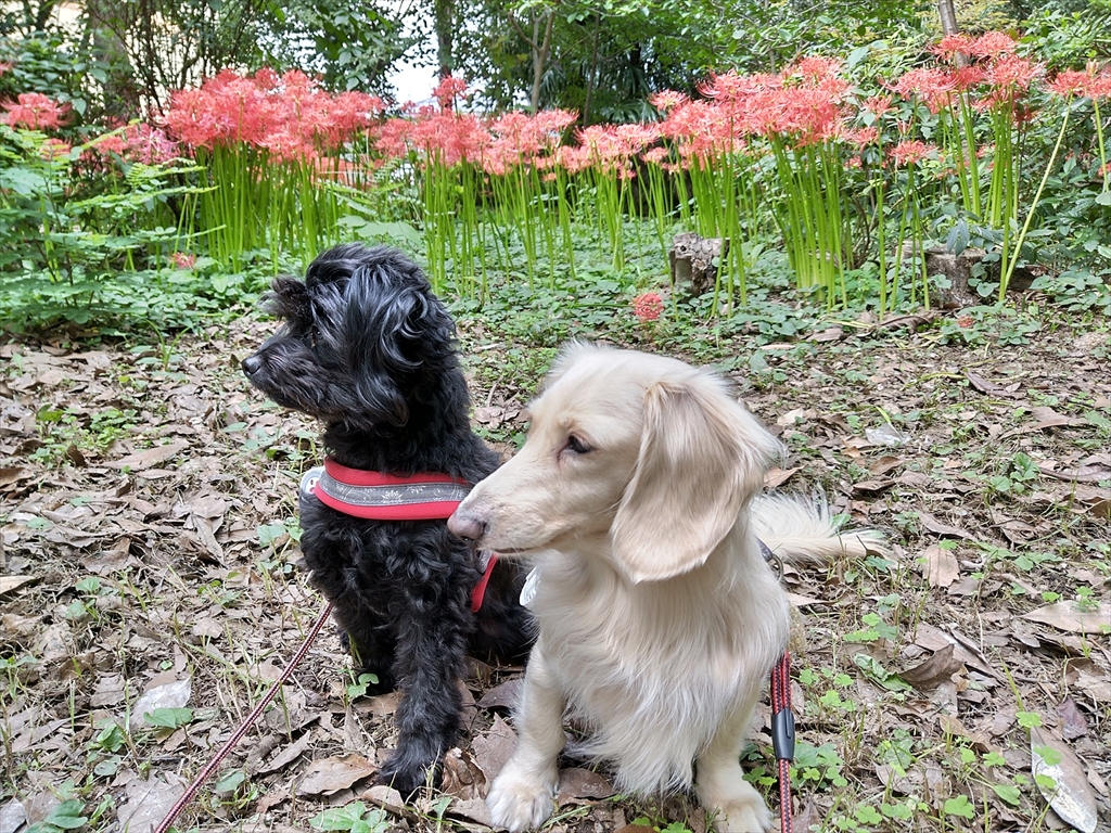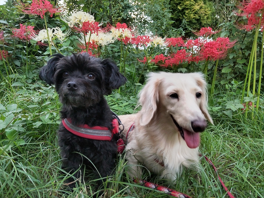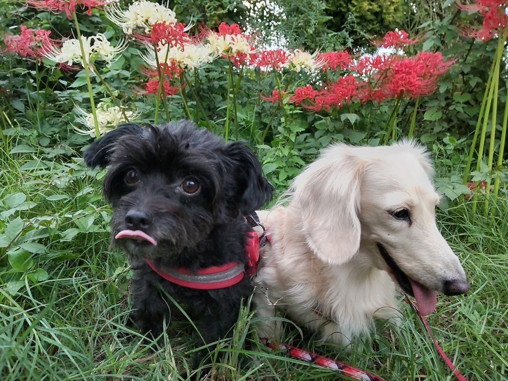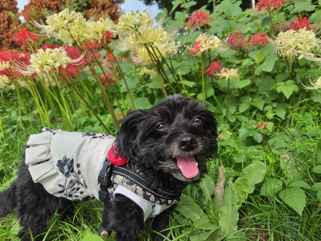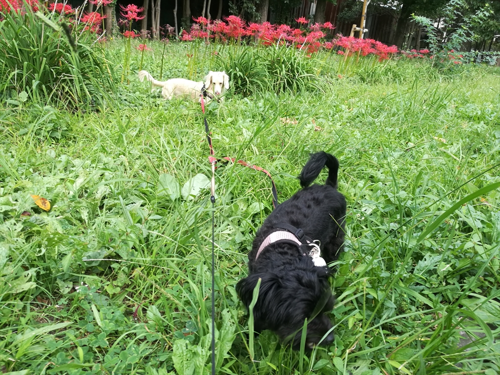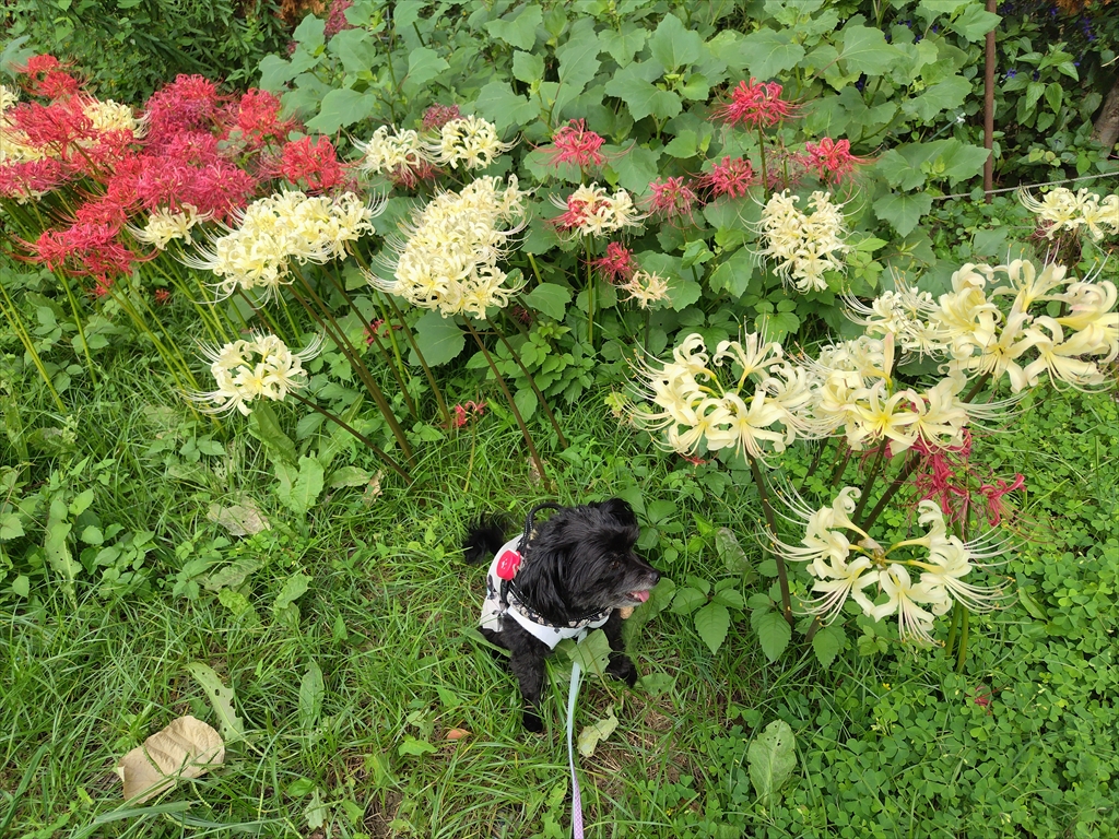 紅白の彼岸花の咲く公園を散歩する犬