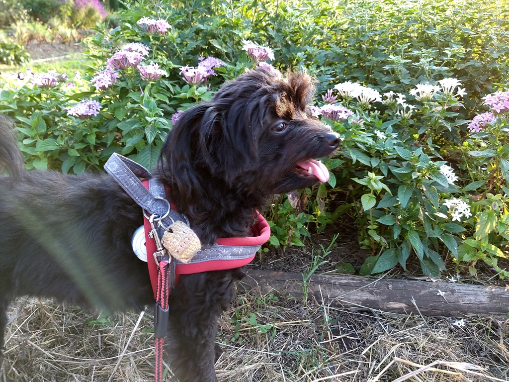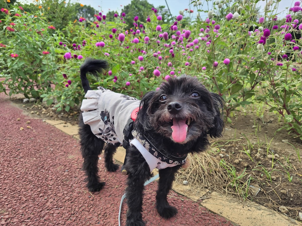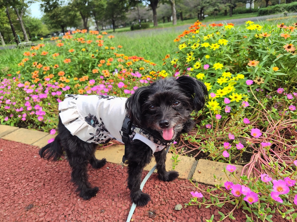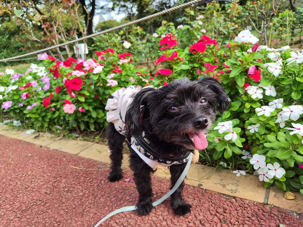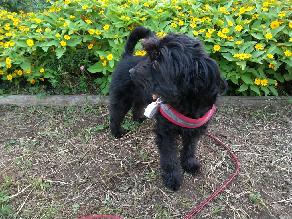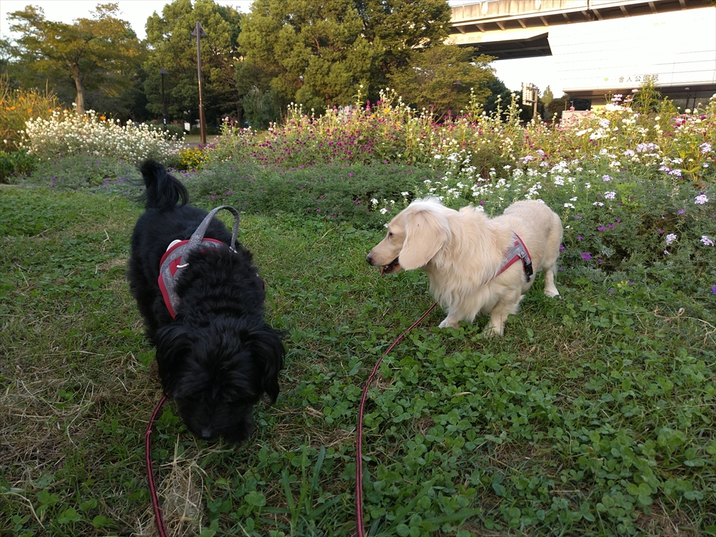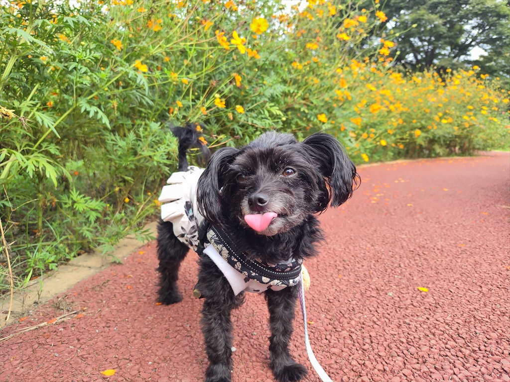 秋の花養生中の公園を散歩する犬。