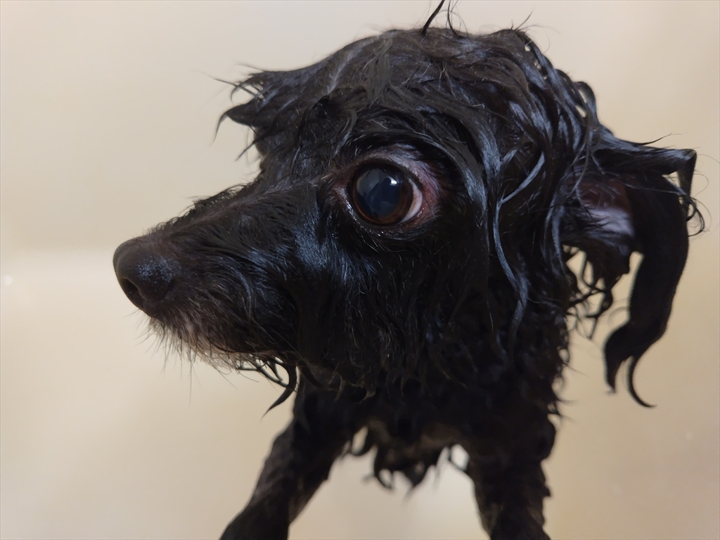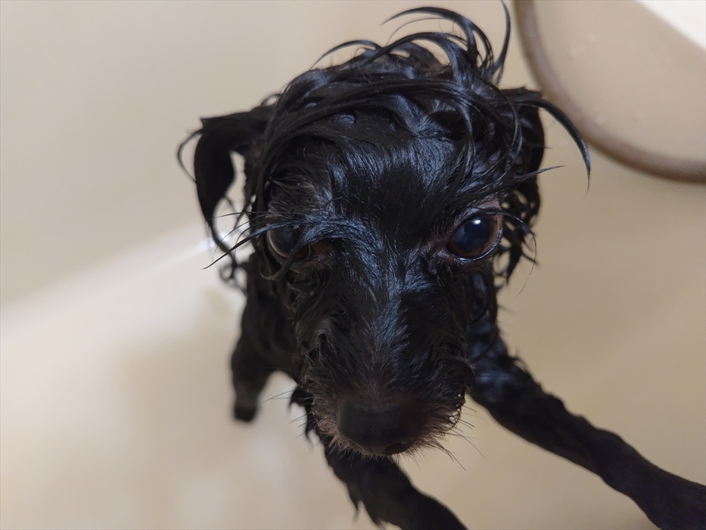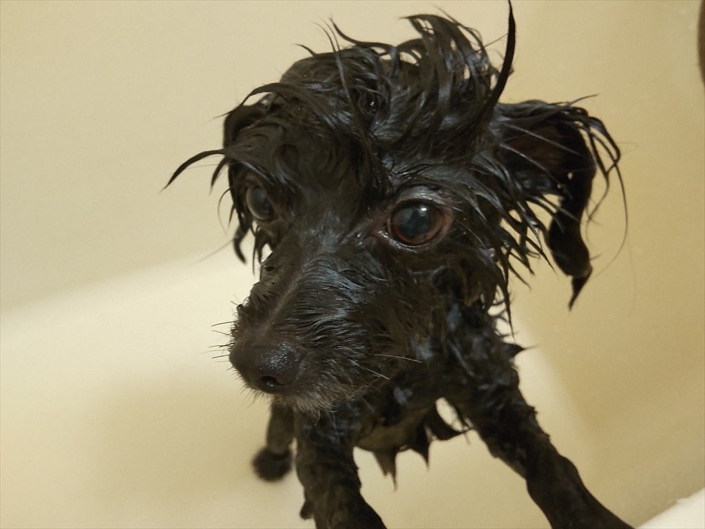 シャンプーされてお怒り中の犬。