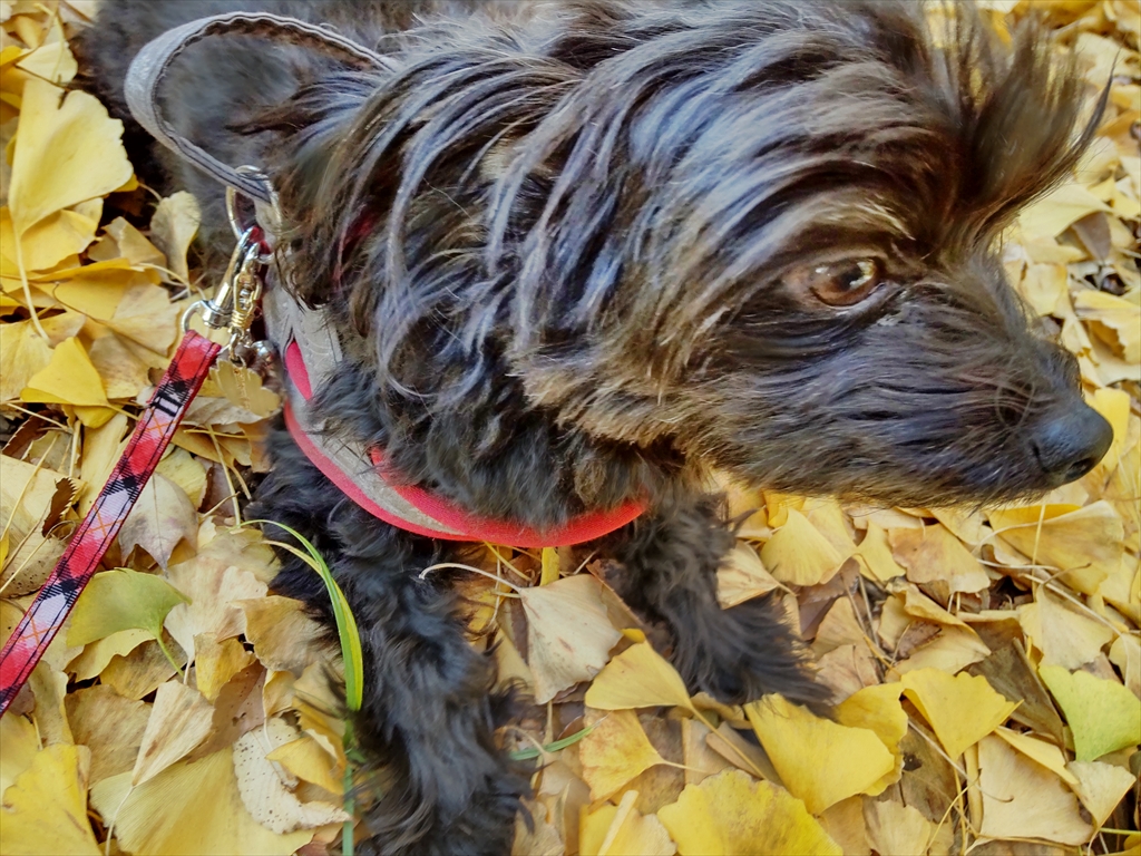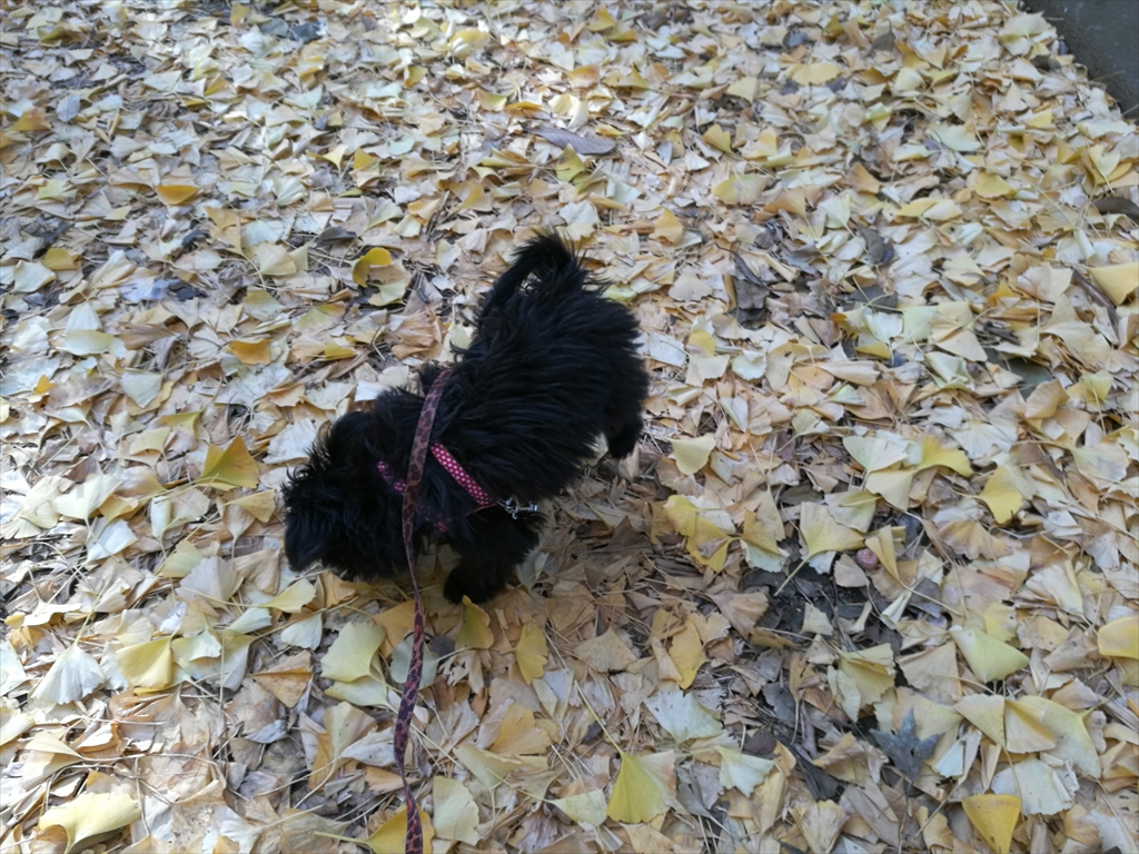 イチョウの絨毯の上でちょっとだけ遊んでみた犬。