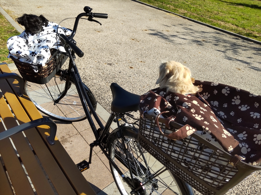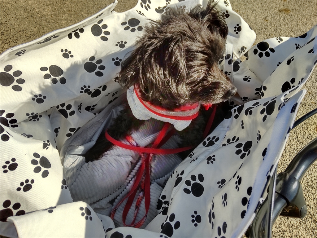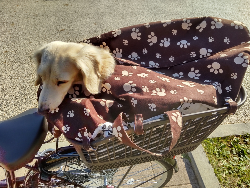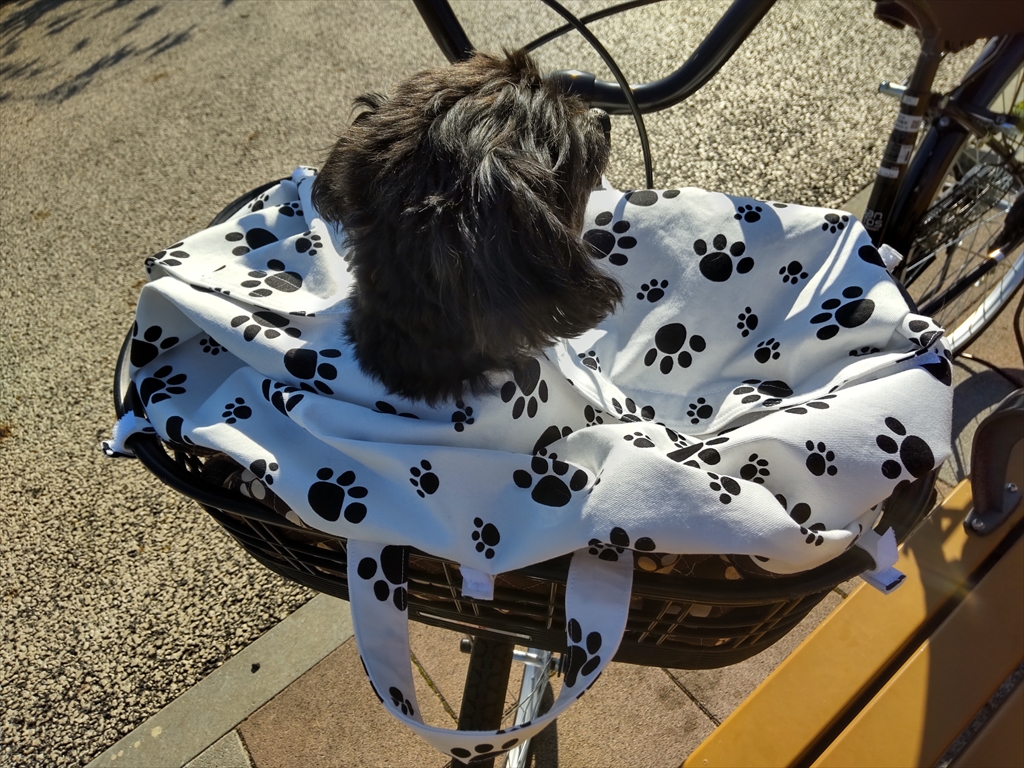 新作の自転車のカゴ用犬バッグの乗り心地を確認する犬。