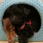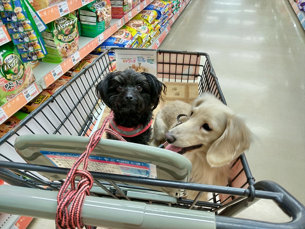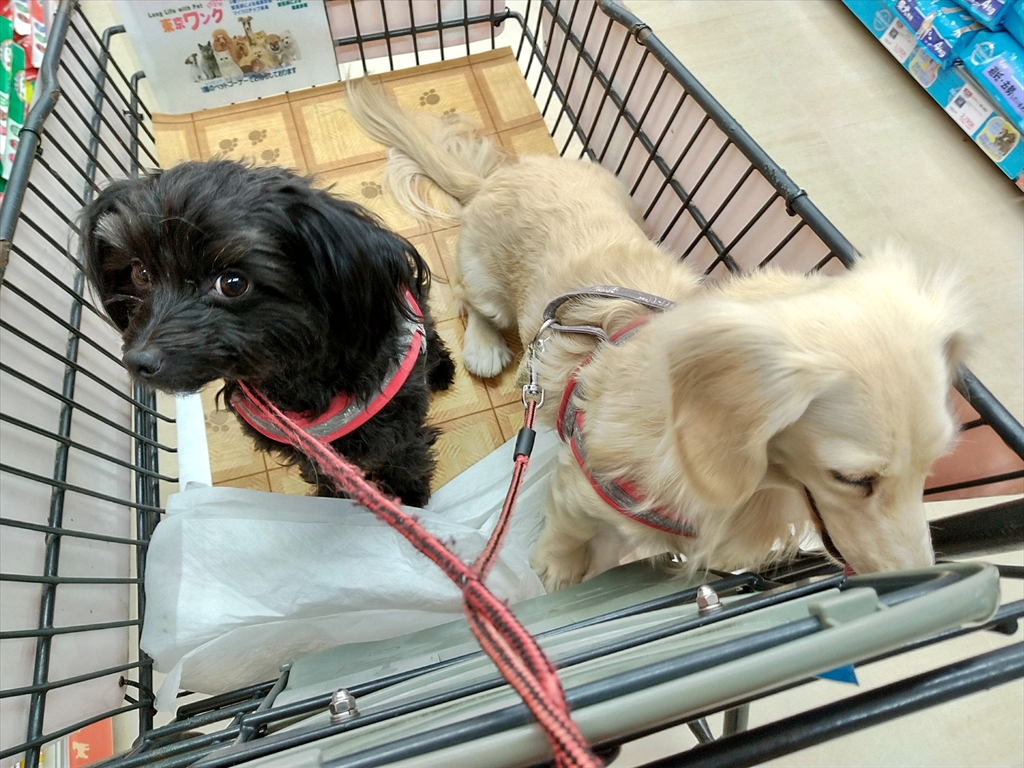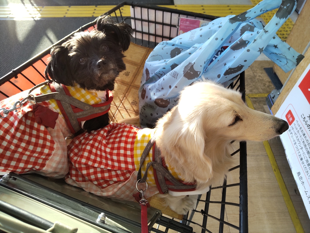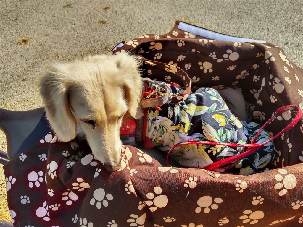 新作の自転車のカゴ用犬バッグの乗り心地を確認する犬。
