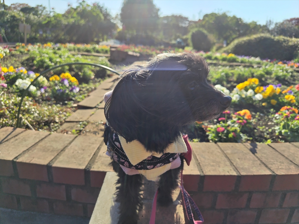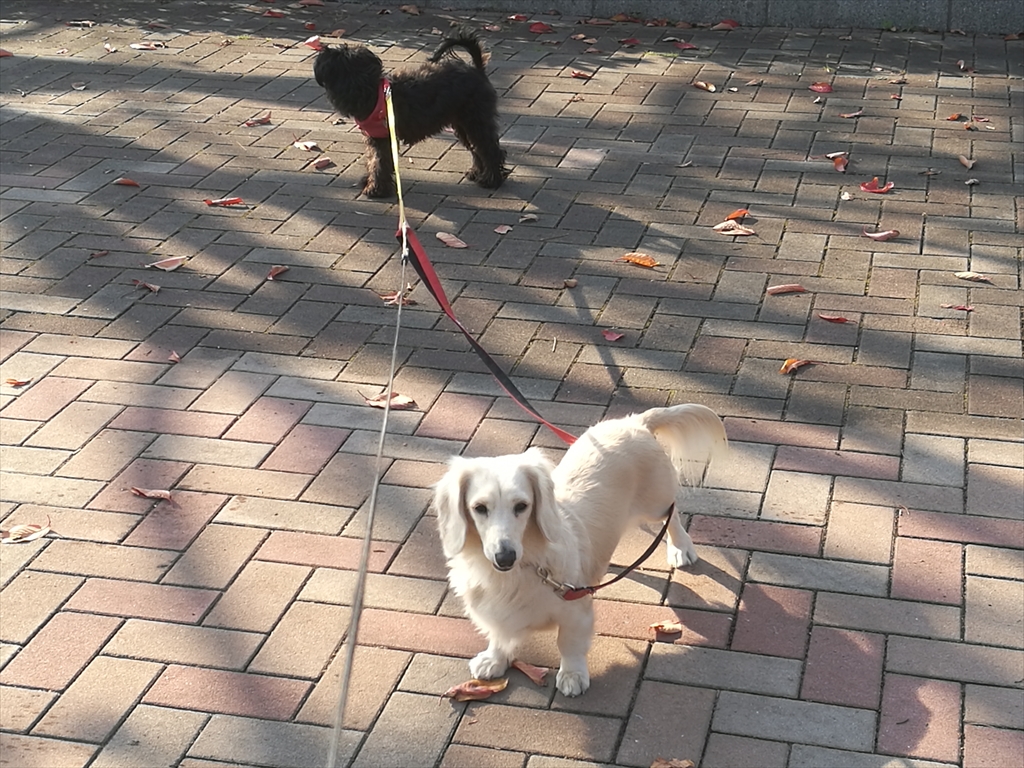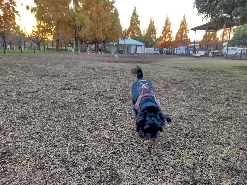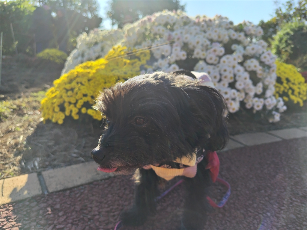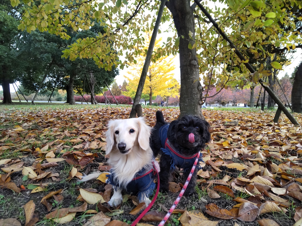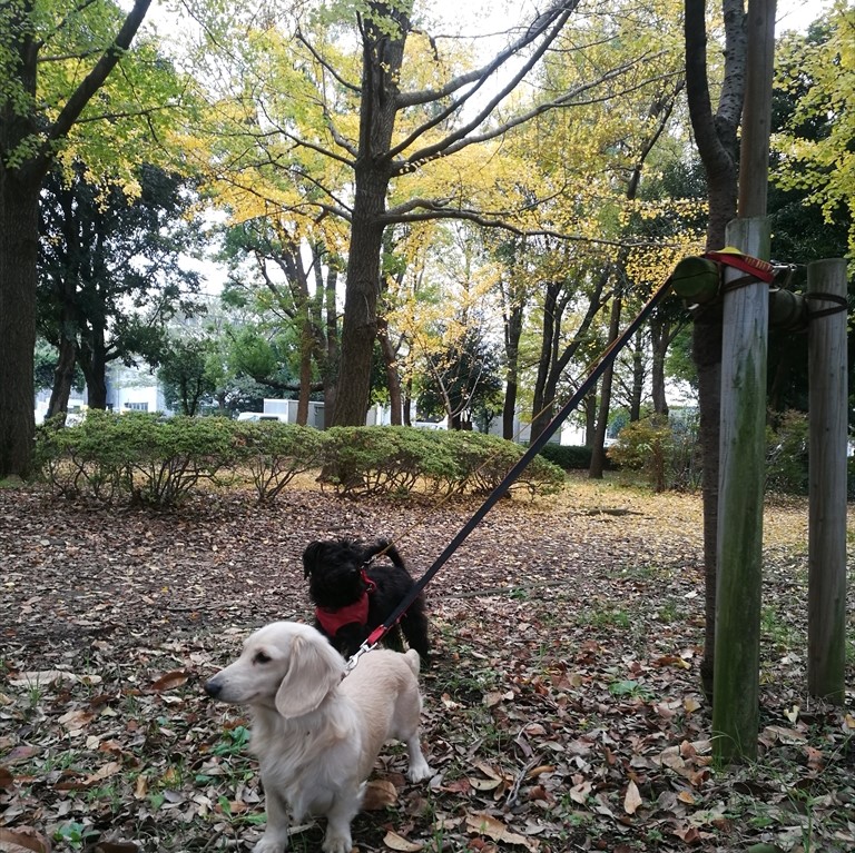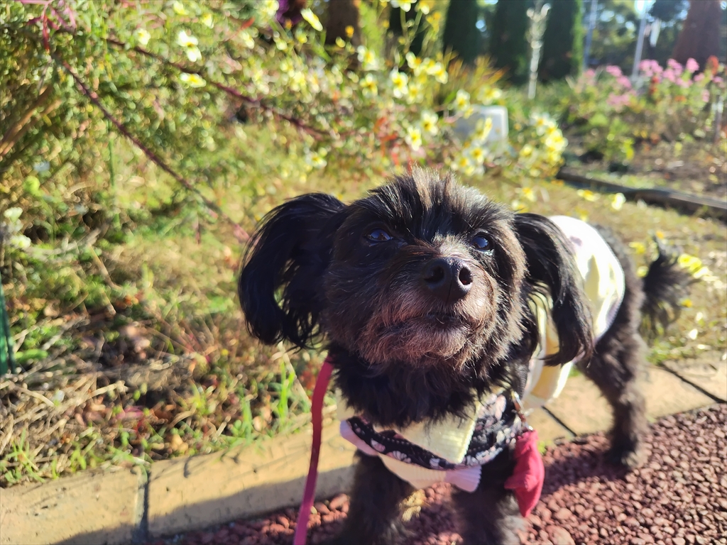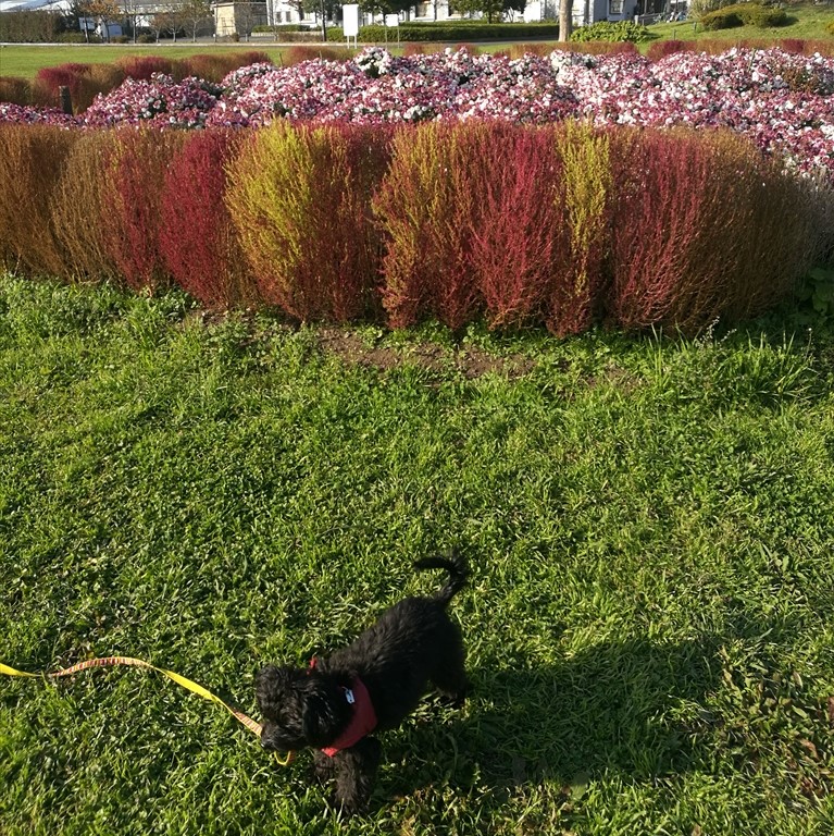 秋の花咲く公園を散歩する犬と、いつものドッグラン。
