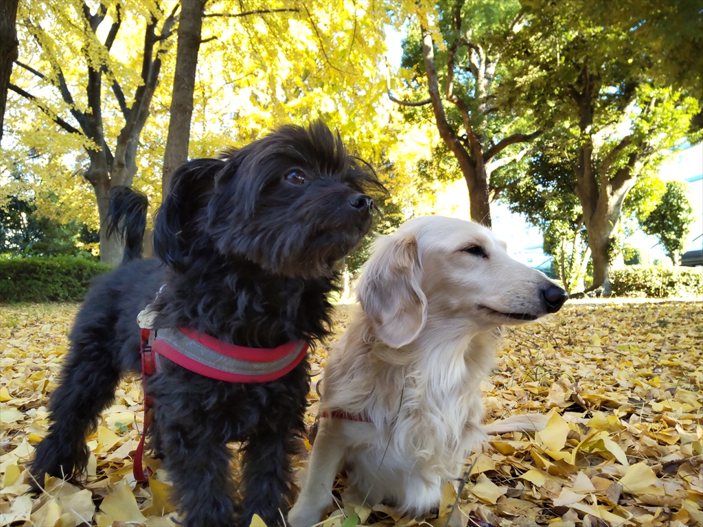 イチョウ並木のある公園で、イチョウの絨毯の上を散歩する犬。